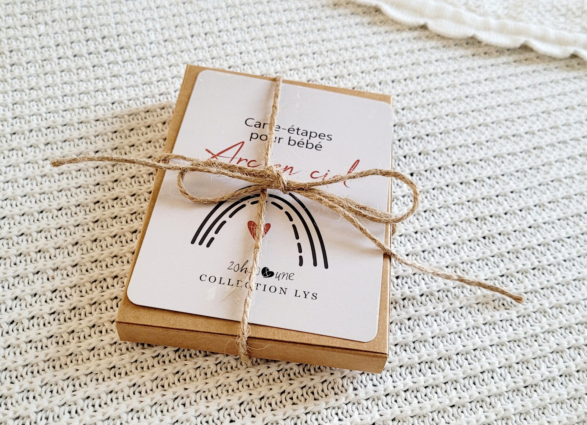 10 cartes recto/verso de suivi de grossesse. Cartons 12 pt aux coins arrondis. Les cartes ont un fond de couleur beige/gris très pâle.