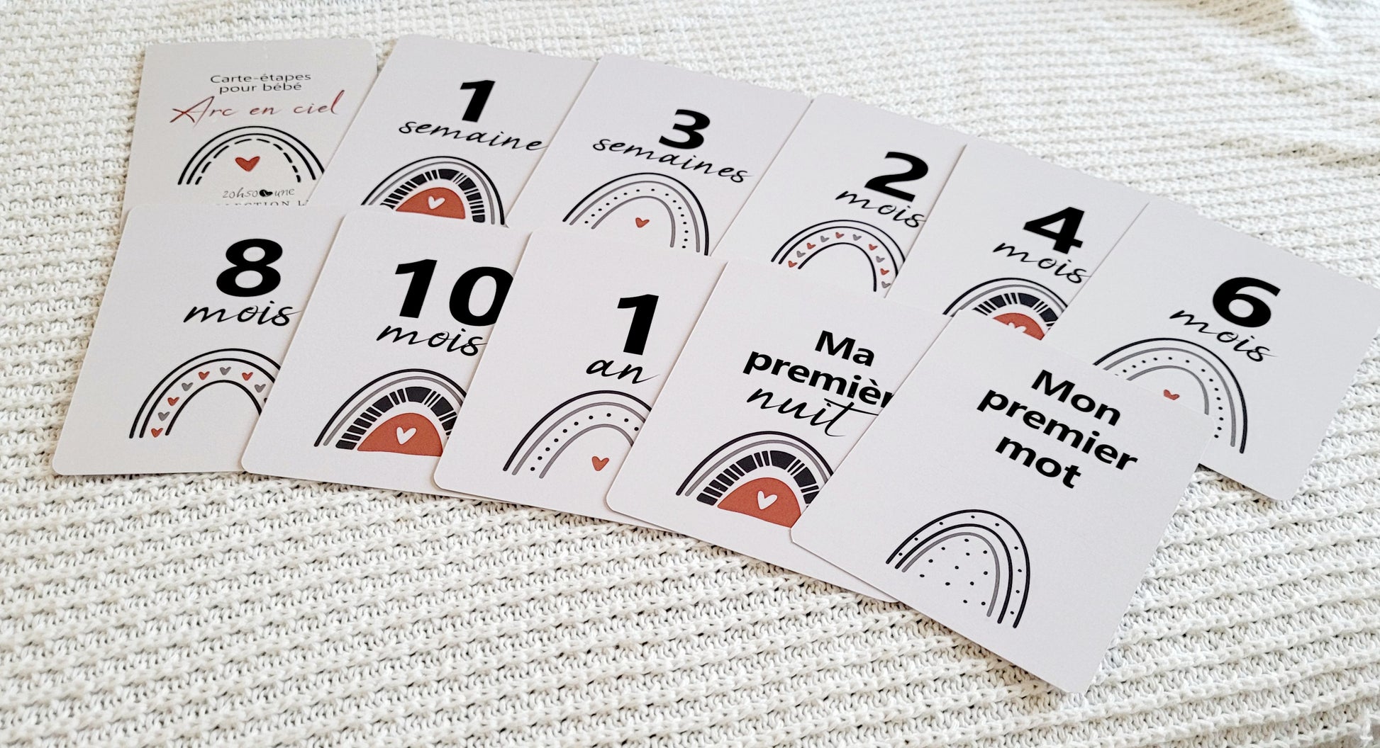 Coucou + informations de naissance / 1-2-3 semaines / 1-2-3-4-5-6-7-8-9-10-11 mois / 1 an / Mes premiers sourires / Ma première nuit / Mon premier mot / Mes premiers pas