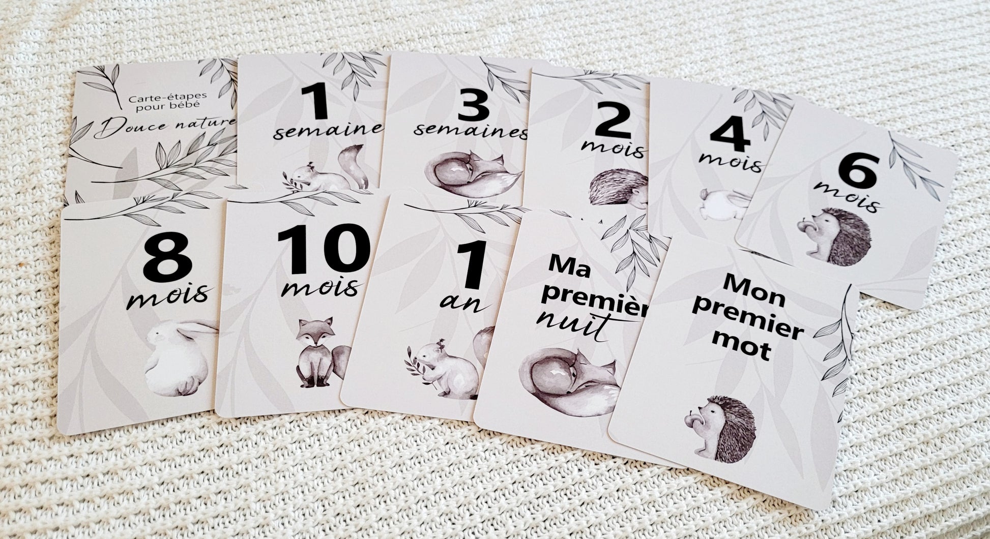 Coucou + informations de naissance / 1-2-3 semaines / 1-2-3-4-5-6-7-8-9-10-11 mois / 1 an / Mes premiers sourires / Ma première nuit / Mon premier mot / Mes premiers pas
