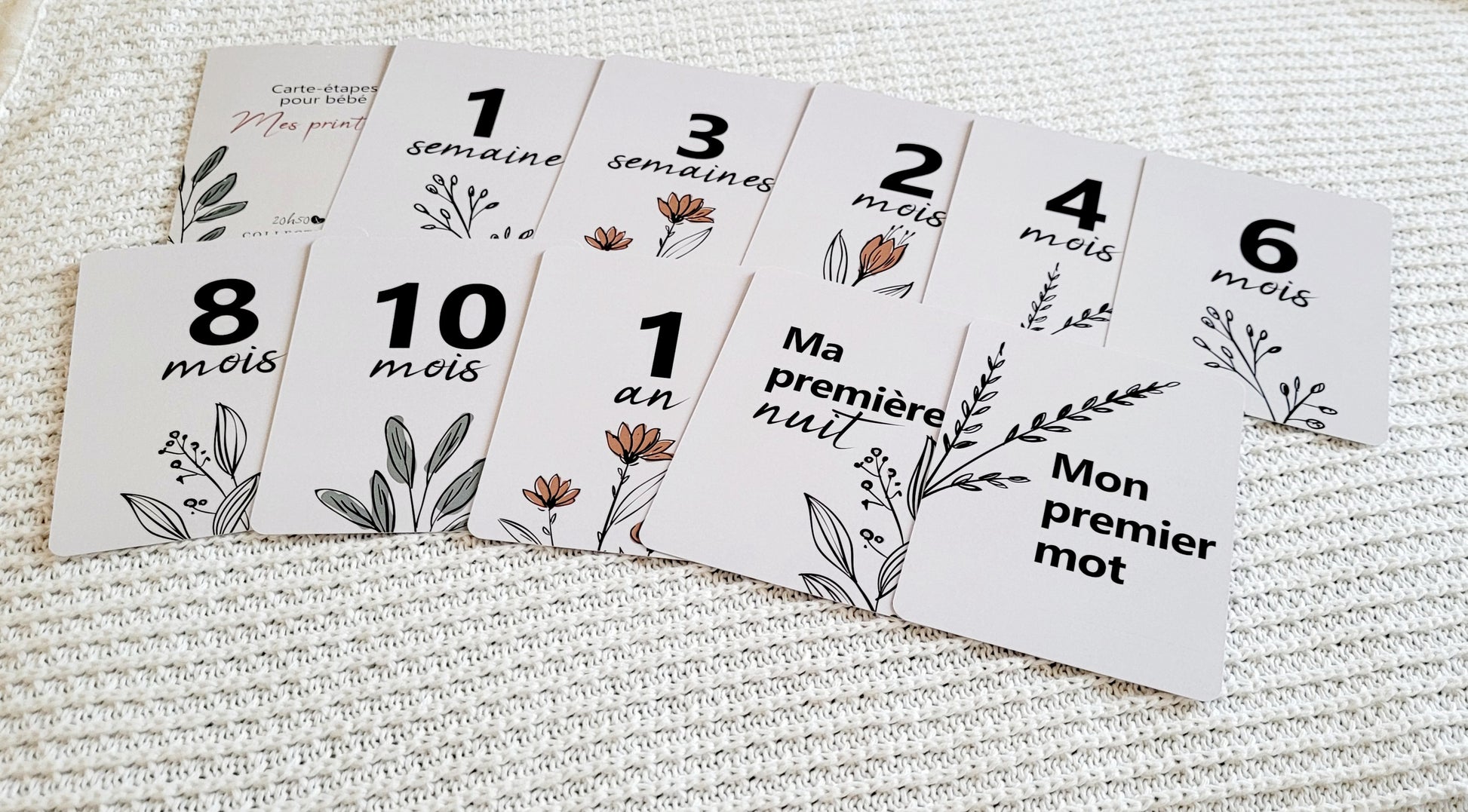 Coucou + informations de naissance / 1-2-3 semaines / 1-2-3-4-5-6-7-8-9-10-11 mois / 1 an / Mes premiers sourires / Ma première nuit / Mon premier mot / Mes premiers pas