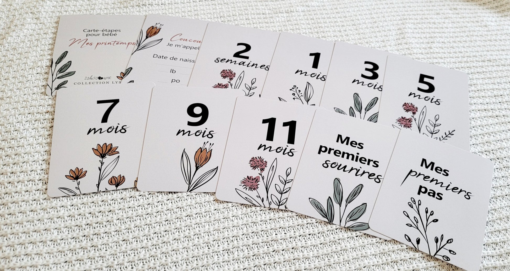 10 cartes recto/verso de suivi de grossesse. Cartons 12 pt aux coins arrondis. Les cartes ont un fond de couleur beige/gris très pâle.
