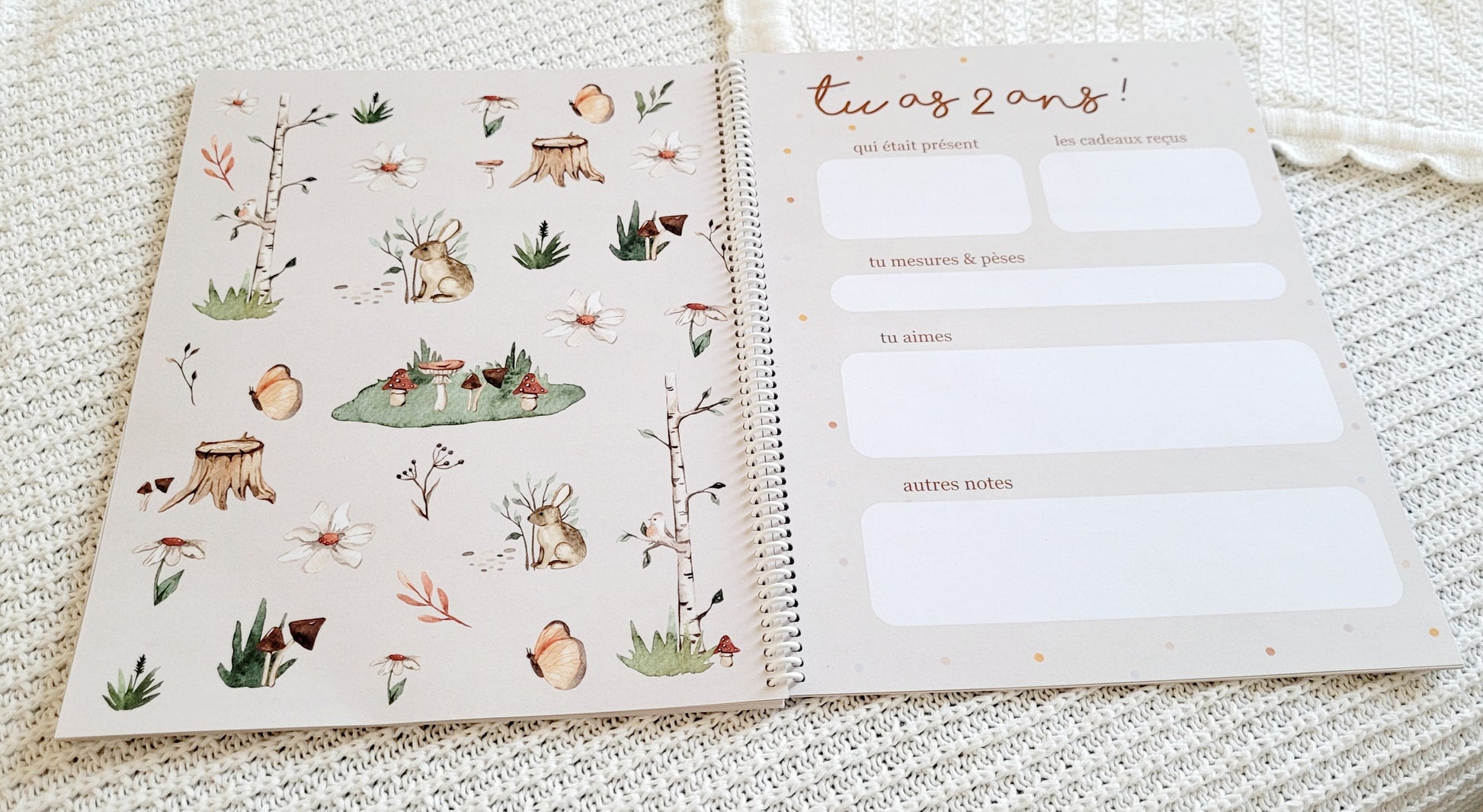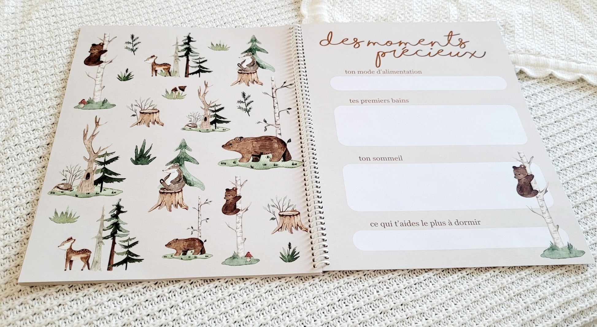 Avant toi, la famille, la grossesse mois par mois, un livre complet de naissance (ta naissance, tes premiers jours, tes empreintes, tes premières fois, ton premier Noël, tes premières vacances, premières dents, premiers repas, une page pour chaque mois, ton premier anniversaire) et des pages de l'évolution de 1 an à 5 ans (chef d'oeuvre, tu as X ans, entre X et X ans, j'apprends à parler, la propreté.