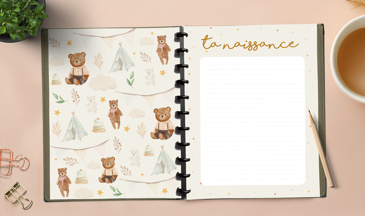 Avant toi, la famille, la grossesse mois par mois, un livre complet de naissance (ta naissance, tes premiers jours, tes empreintes, tes premières fois, ton premier Noël, tes premières vacances, premières dents, premiers repas, une page pour chaque mois, ton premier anniversaire) et des pages de l'évolution de 1 an à 5 ans (chef d'oeuvre, tu as X ans, entre X et X ans, j'apprends à parler, la propreté.